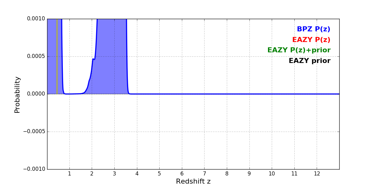 In P(z) plots: Yellow lines mark the cluster redshift z = 0.443,