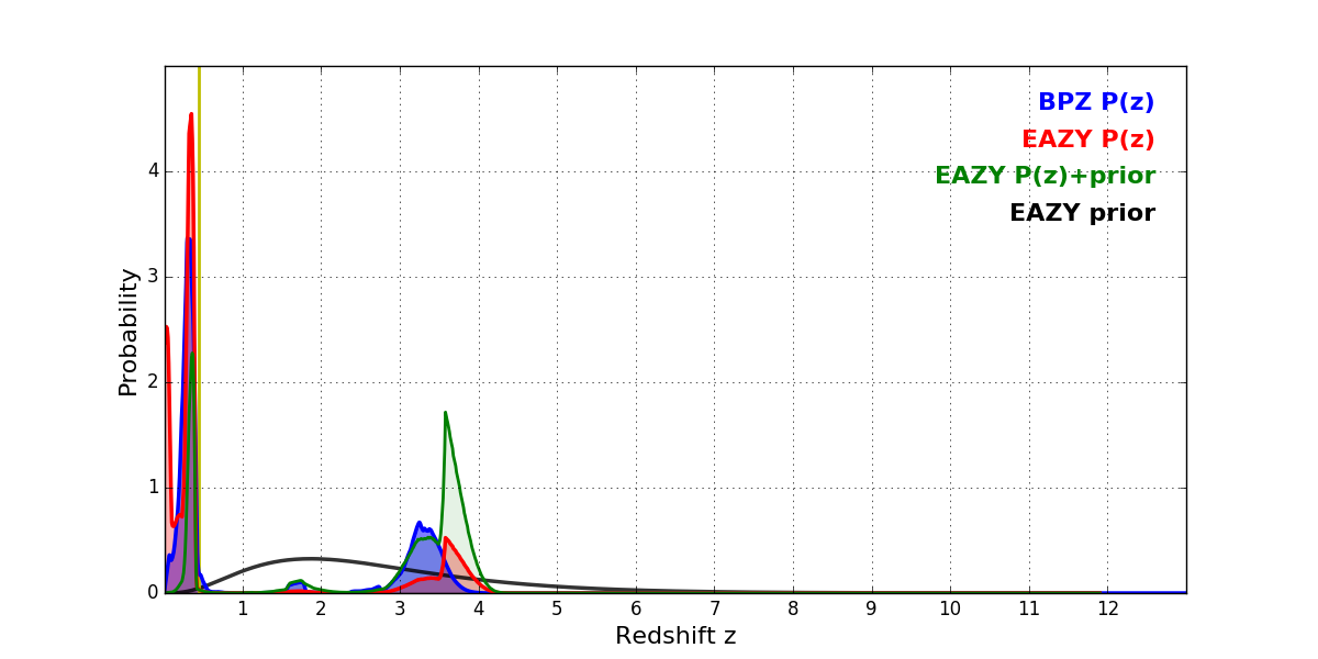 In P(z) plots: Yellow lines mark the cluster redshift z = 0.443,