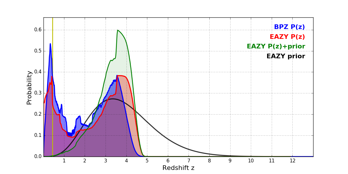 In P(z) plots: Yellow lines mark the cluster redshift z = 0.443,