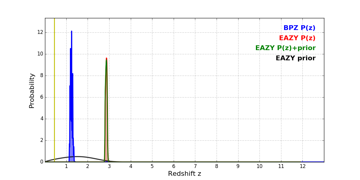 In P(z) plots: Yellow lines mark the cluster redshift z = 0.443,