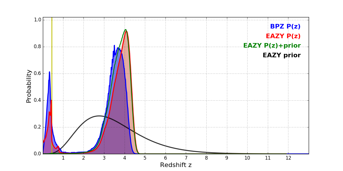 In P(z) plots: Yellow lines mark the cluster redshift z = 0.443,