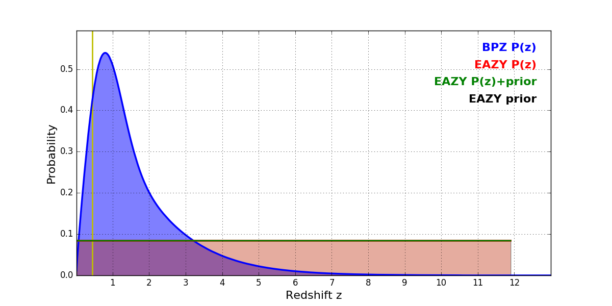 In P(z) plots: Yellow lines mark the cluster redshift z = 0.443,