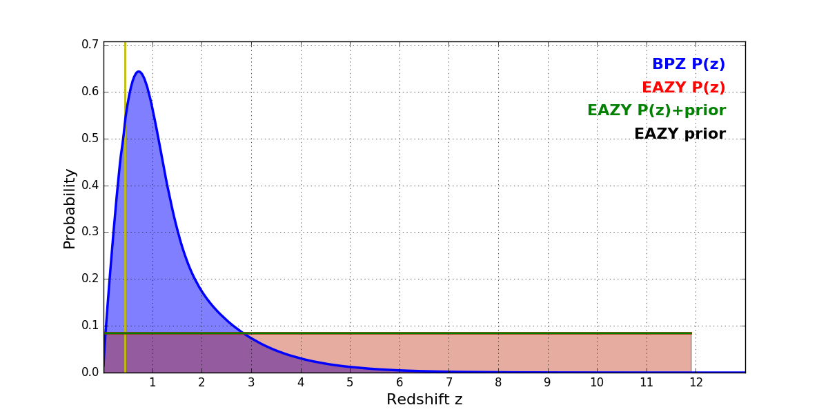 In P(z) plots: Yellow lines mark the cluster redshift z = 0.443,