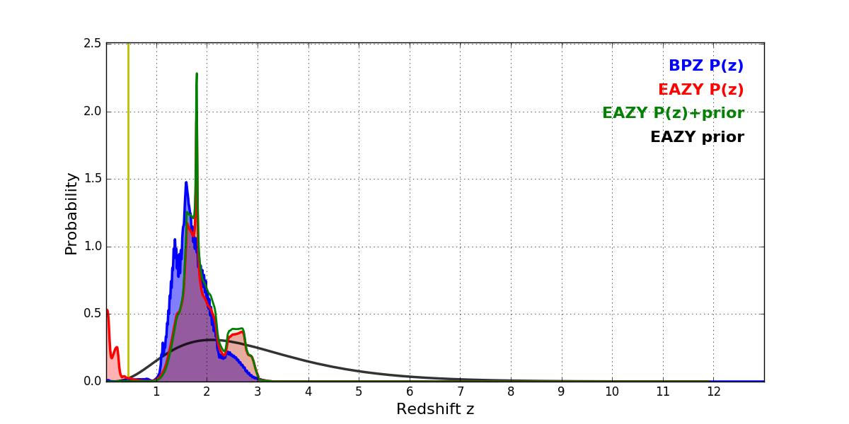 In P(z) plots: Yellow lines mark the cluster redshift z = 0.443,