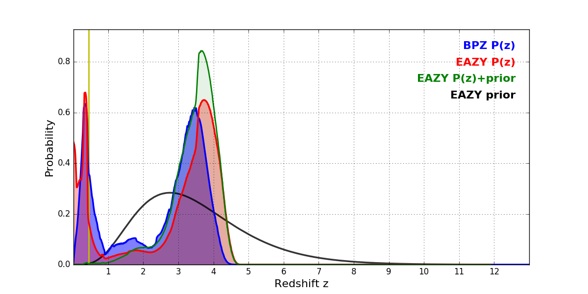In P(z) plots: Yellow lines mark the cluster redshift z = 0.443,