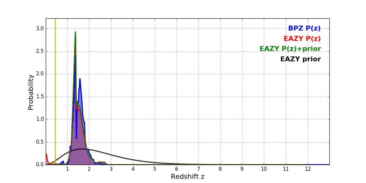 In P(z) plots: Yellow lines mark the cluster redshift z = 0.443,
