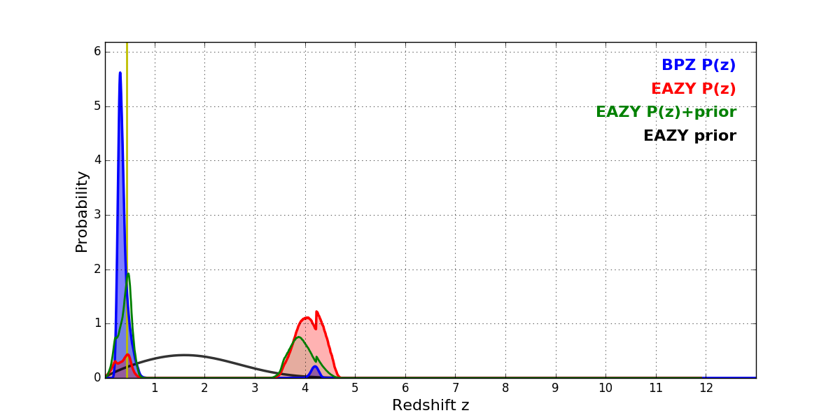 In P(z) plots: Yellow lines mark the cluster redshift z = 0.443,