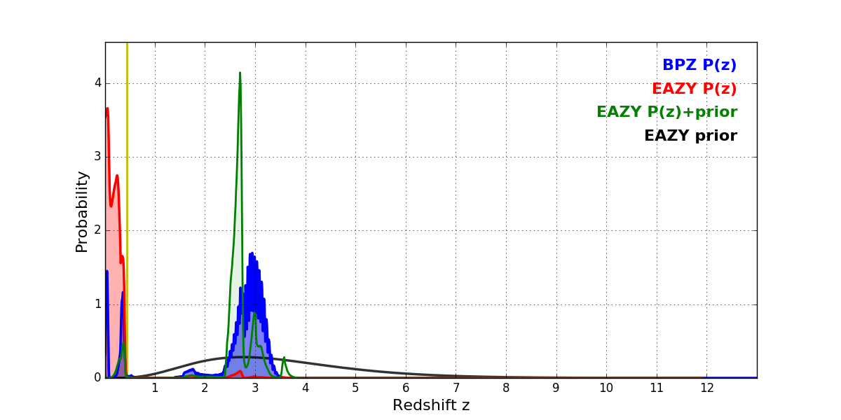 In P(z) plots: Yellow lines mark the cluster redshift z = 0.443,