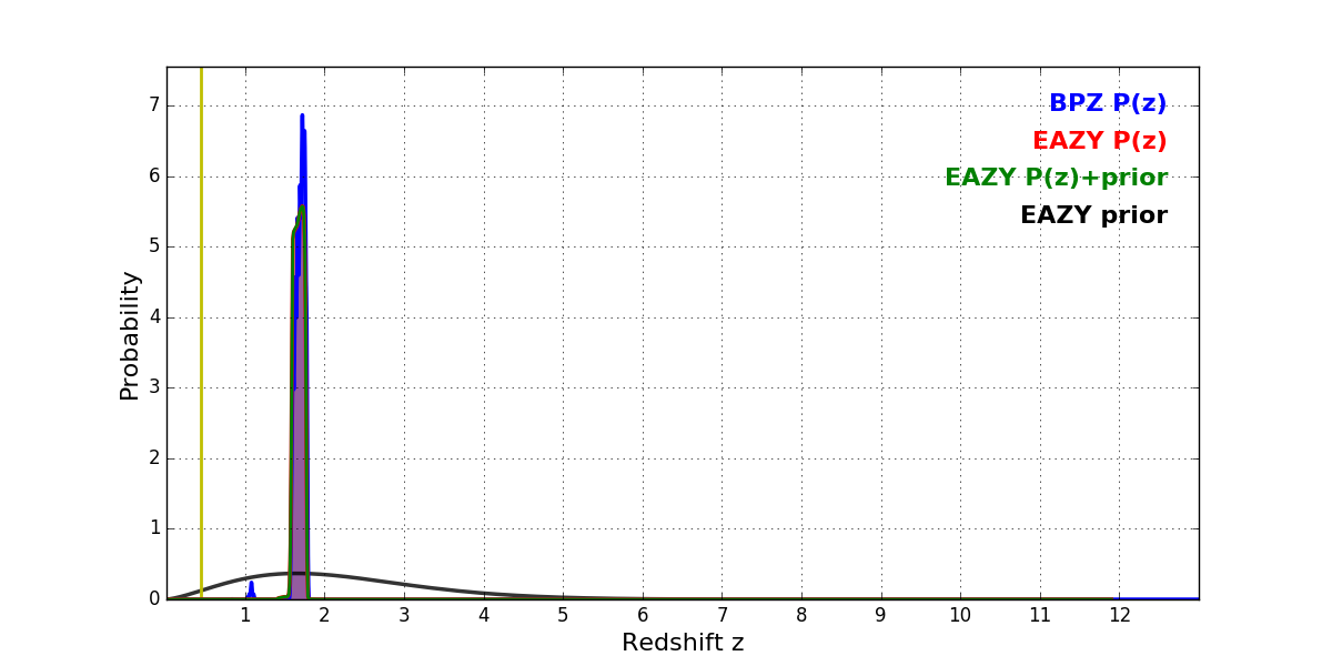 In P(z) plots: Yellow lines mark the cluster redshift z = 0.443,