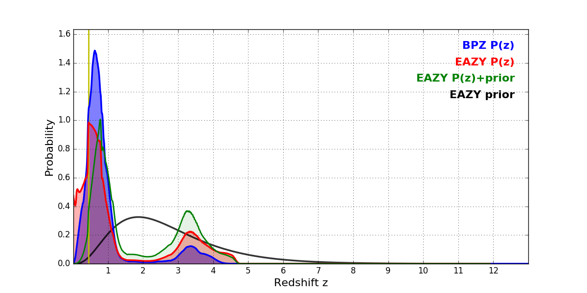 In P(z) plots: Yellow lines mark the cluster redshift z = 0.443,