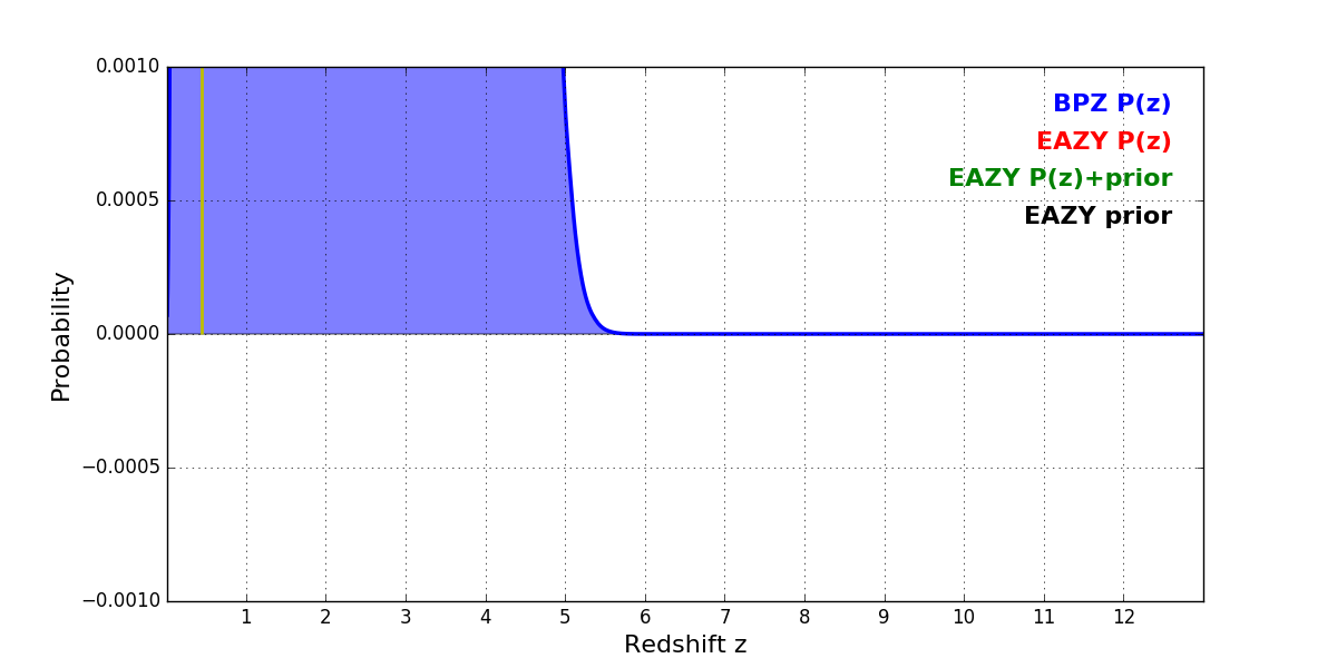 In P(z) plots: Yellow lines mark the cluster redshift z = 0.443,