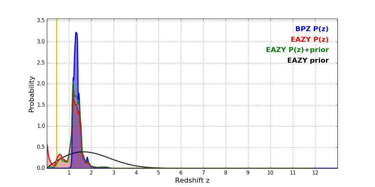 In P(z) plots: Yellow lines mark the cluster redshift z = 0.443,