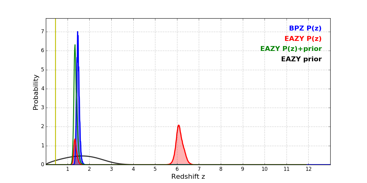 In P(z) plots: Yellow lines mark the cluster redshift z = 0.443,