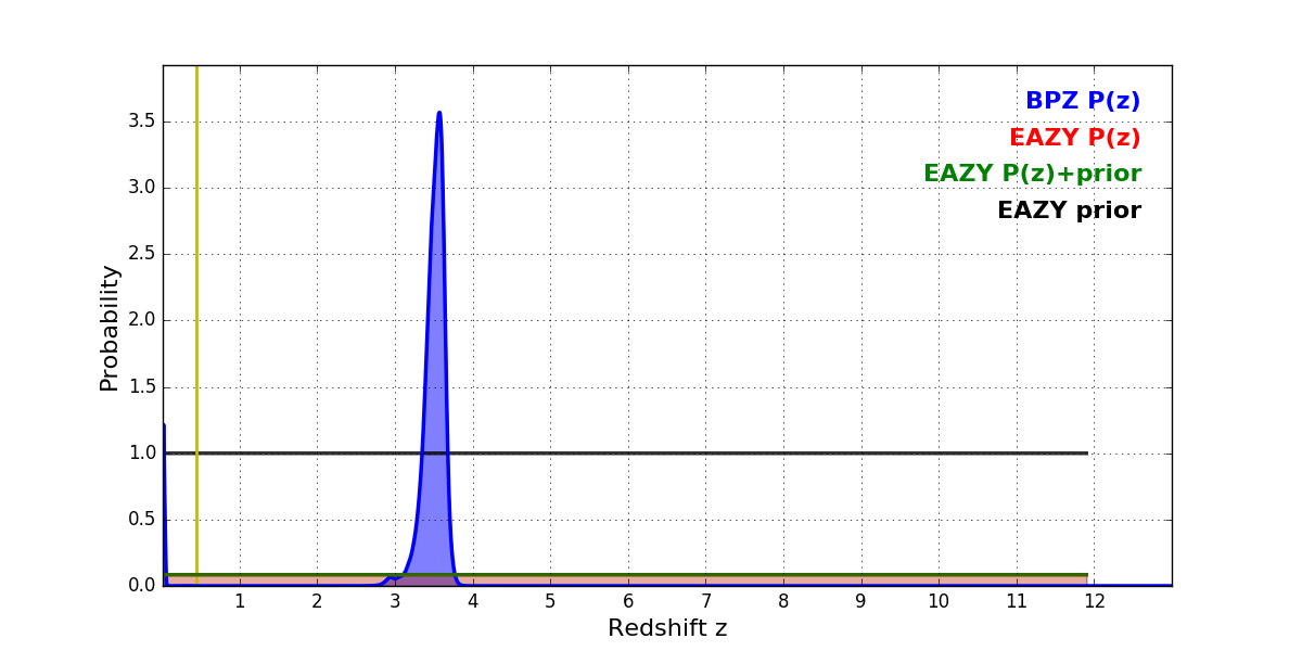 In P(z) plots: Yellow lines mark the cluster redshift z = 0.443,