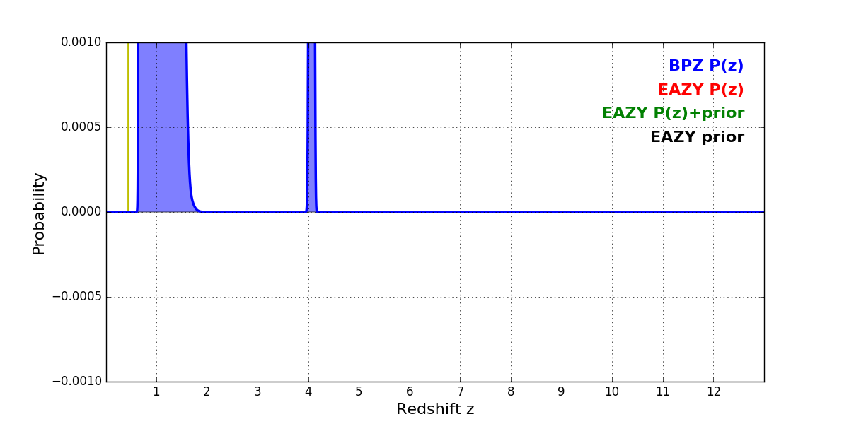 In P(z) plots: Yellow lines mark the cluster redshift z = 0.443,