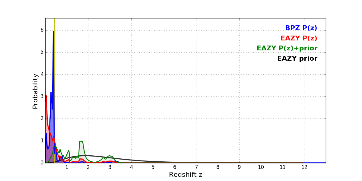 In P(z) plots: Yellow lines mark the cluster redshift z = 0.443,