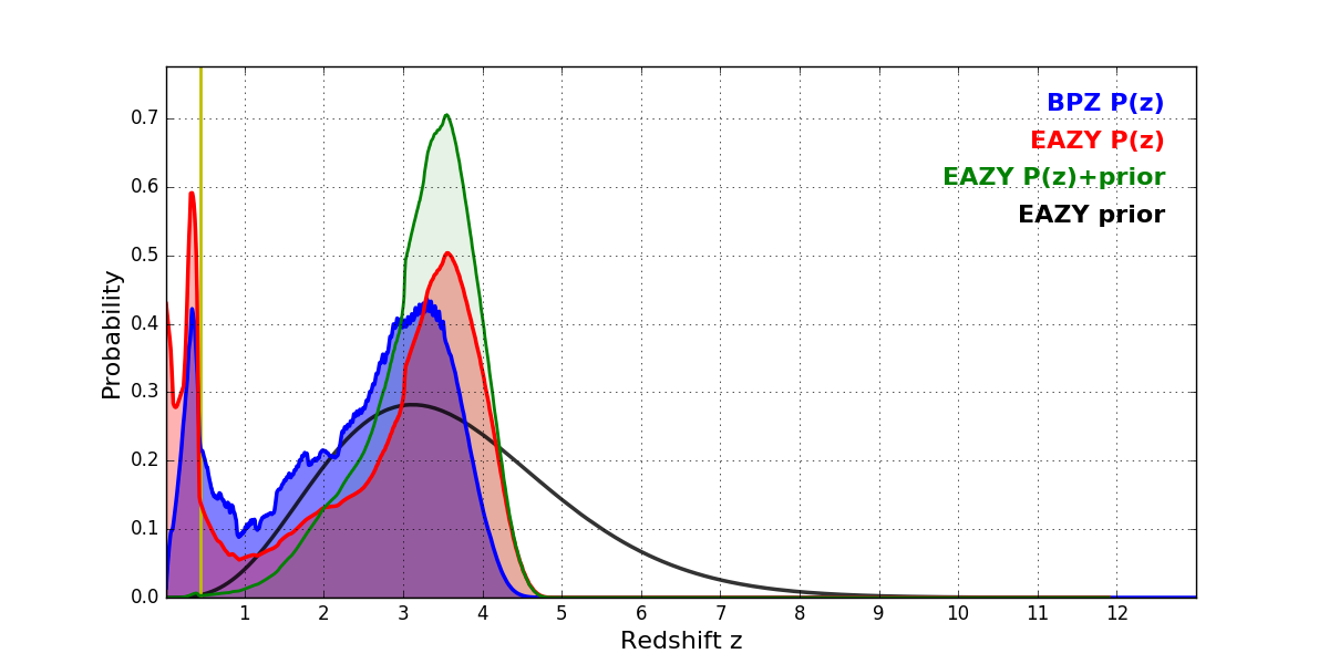 In P(z) plots: Yellow lines mark the cluster redshift z = 0.443,