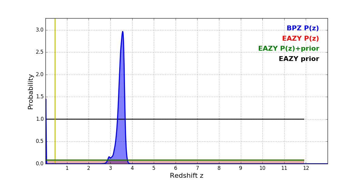 In P(z) plots: Yellow lines mark the cluster redshift z = 0.443,