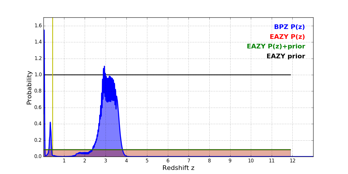 In P(z) plots: Yellow lines mark the cluster redshift z = 0.443,