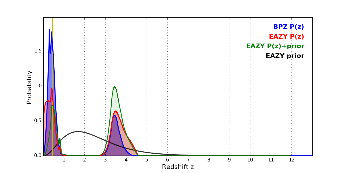 In P(z) plots: Yellow lines mark the cluster redshift z = 0.443,