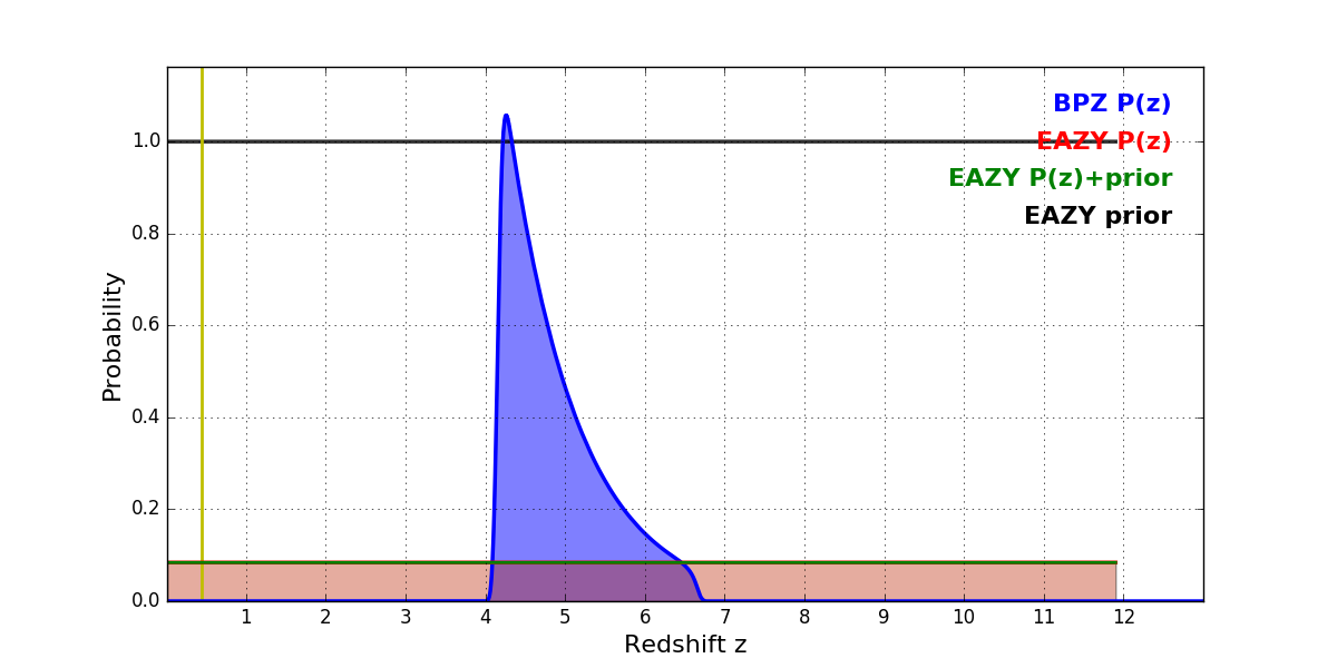 In P(z) plots: Yellow lines mark the cluster redshift z = 0.443,