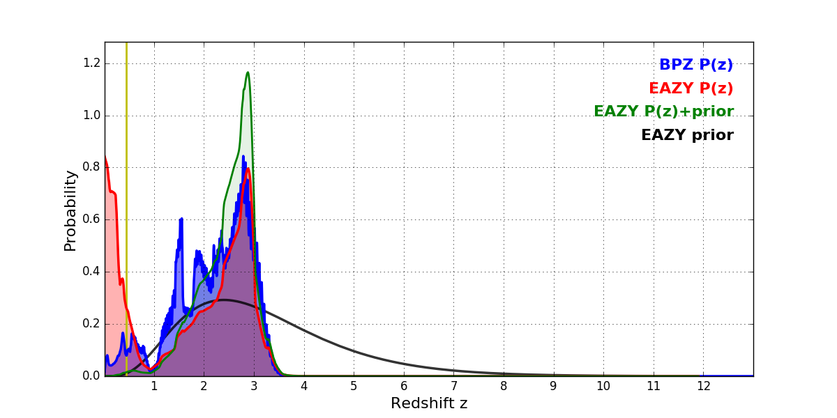 In P(z) plots: Yellow lines mark the cluster redshift z = 0.443,