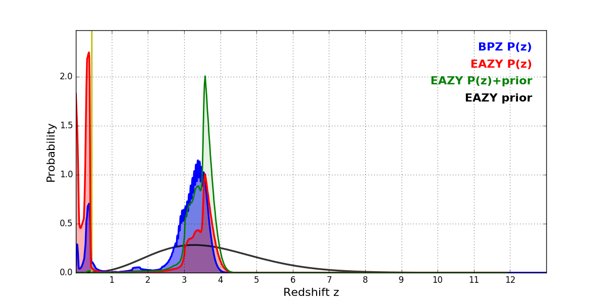 In P(z) plots: Yellow lines mark the cluster redshift z = 0.443,