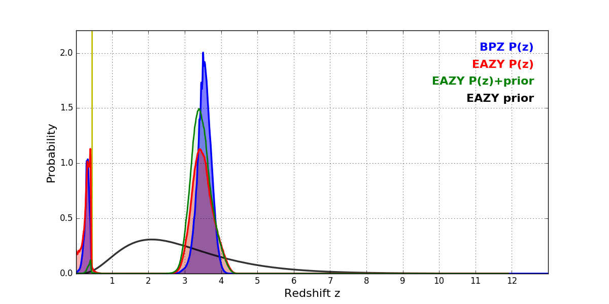 In P(z) plots: Yellow lines mark the cluster redshift z = 0.443,