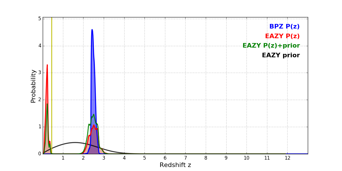 In P(z) plots: Yellow lines mark the cluster redshift z = 0.443,