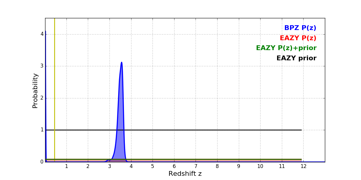 In P(z) plots: Yellow lines mark the cluster redshift z = 0.443,