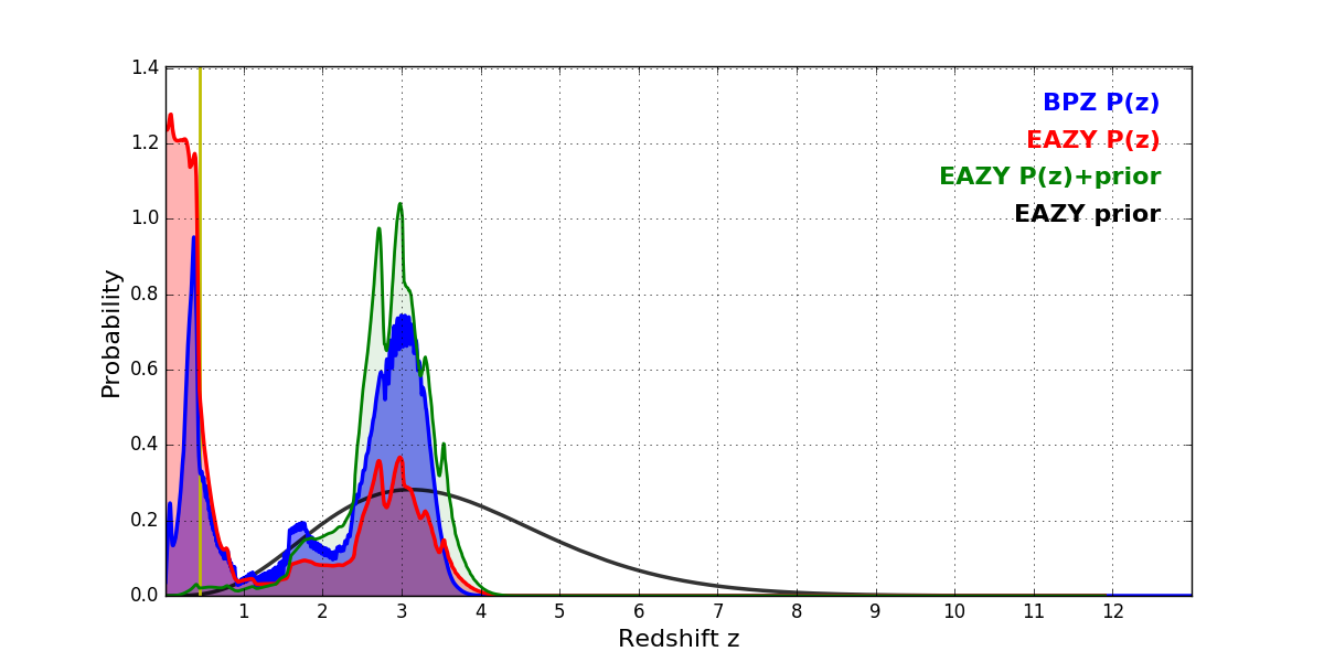 In P(z) plots: Yellow lines mark the cluster redshift z = 0.443,