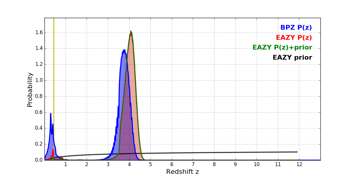 In P(z) plots: Yellow lines mark the cluster redshift z = 0.443,