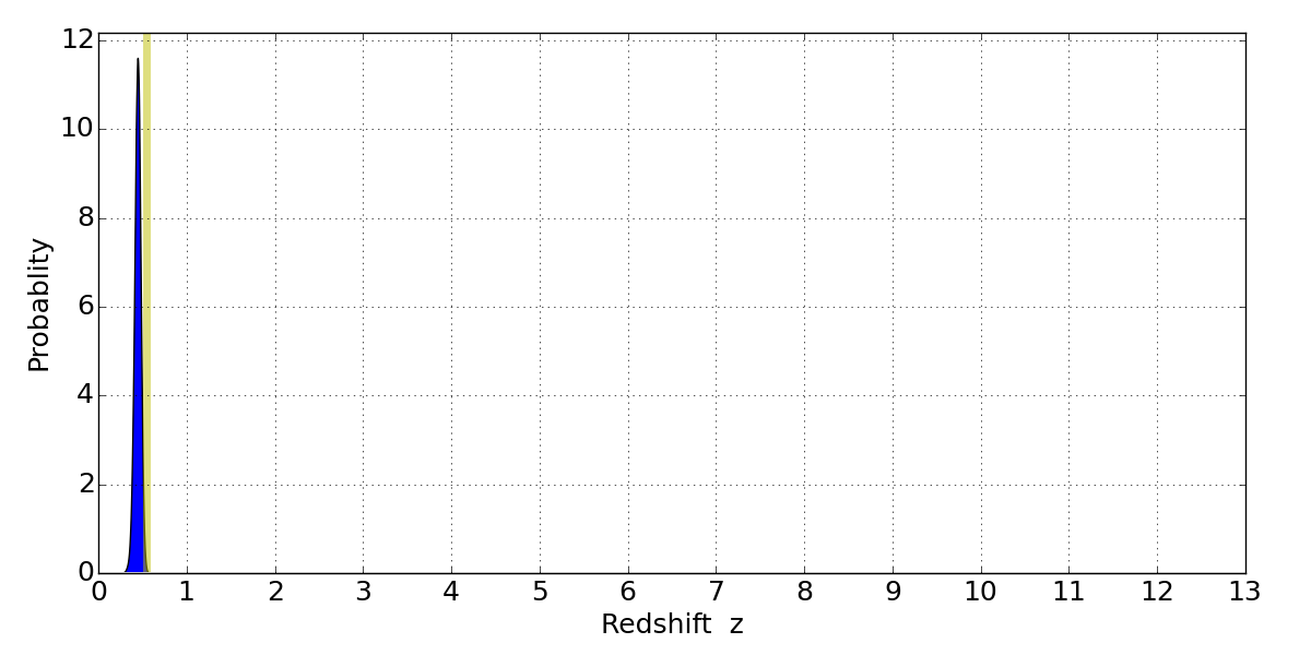 In P(z) plots: Yellow lines mark the cluster redshift z = 0.540,