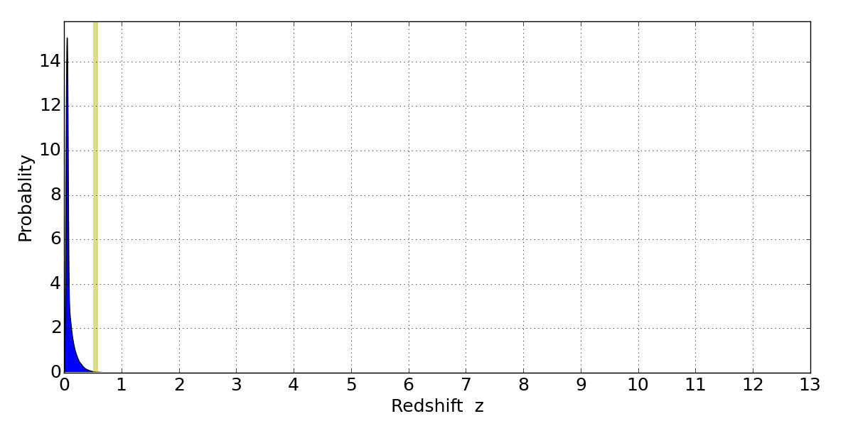 In P(z) plots: Yellow lines mark the cluster redshift z = 0.540,
