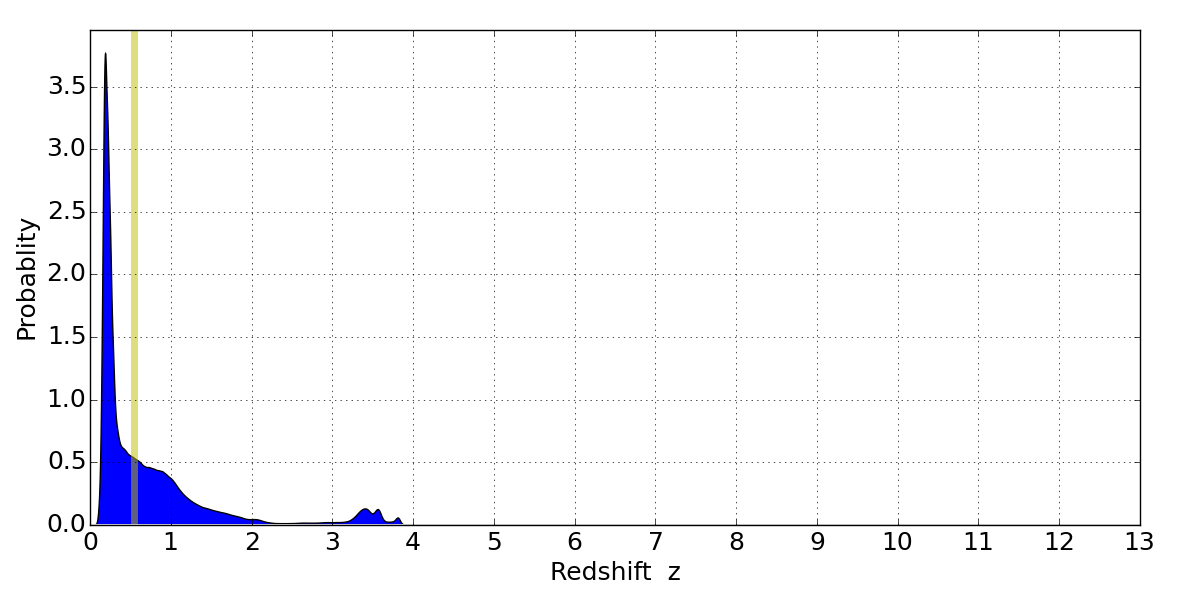 In P(z) plots: Yellow lines mark the cluster redshift z = 0.540,