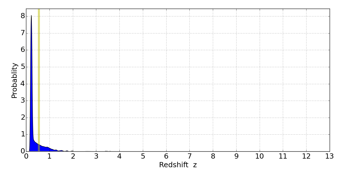 In P(z) plots: Yellow lines mark the cluster redshift z = 0.540,