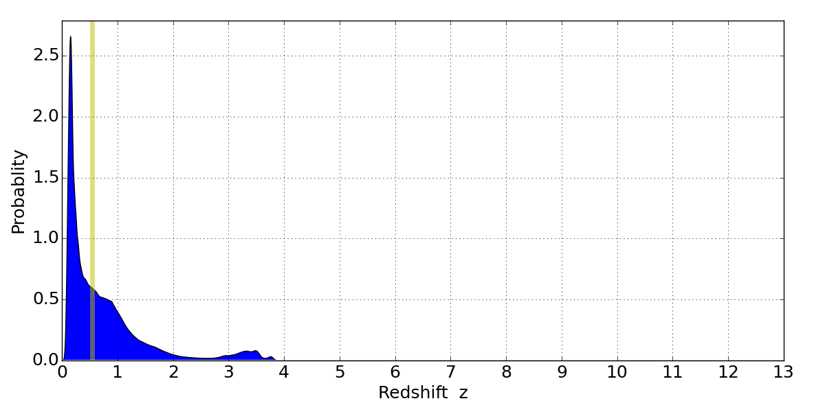 In P(z) plots: Yellow lines mark the cluster redshift z = 0.540,
