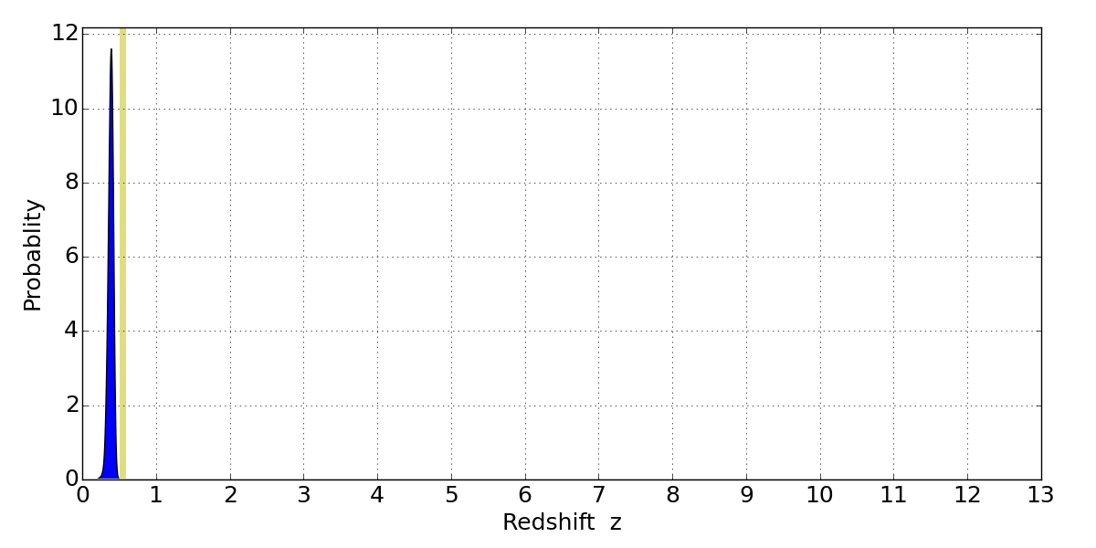 In P(z) plots: Yellow lines mark the cluster redshift z = 0.540,