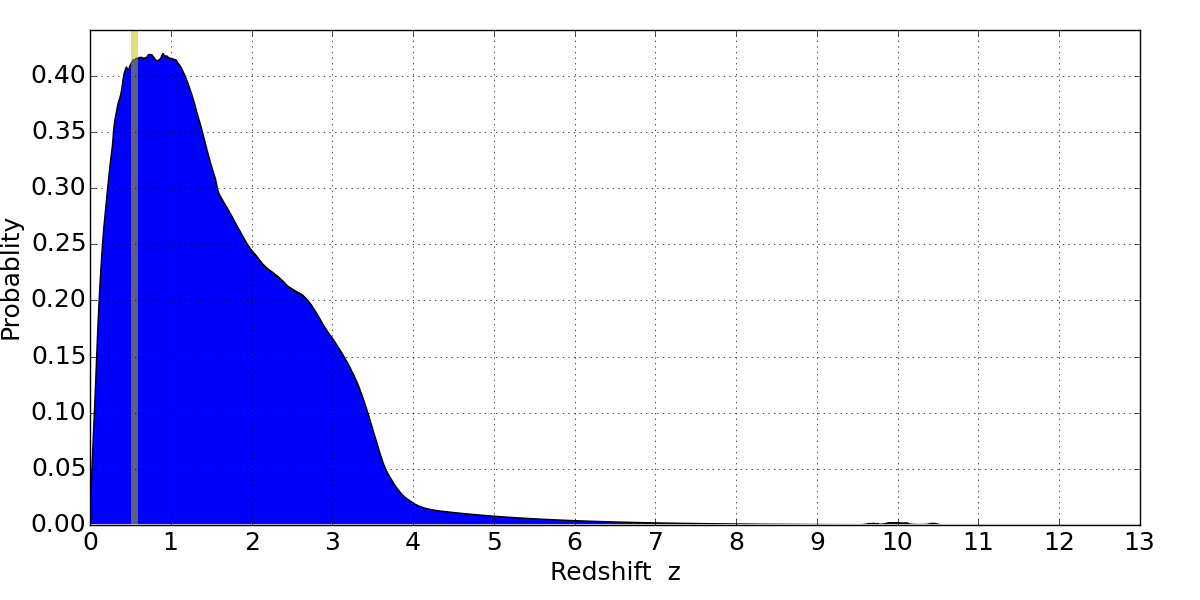 In P(z) plots: Yellow lines mark the cluster redshift z = 0.540,