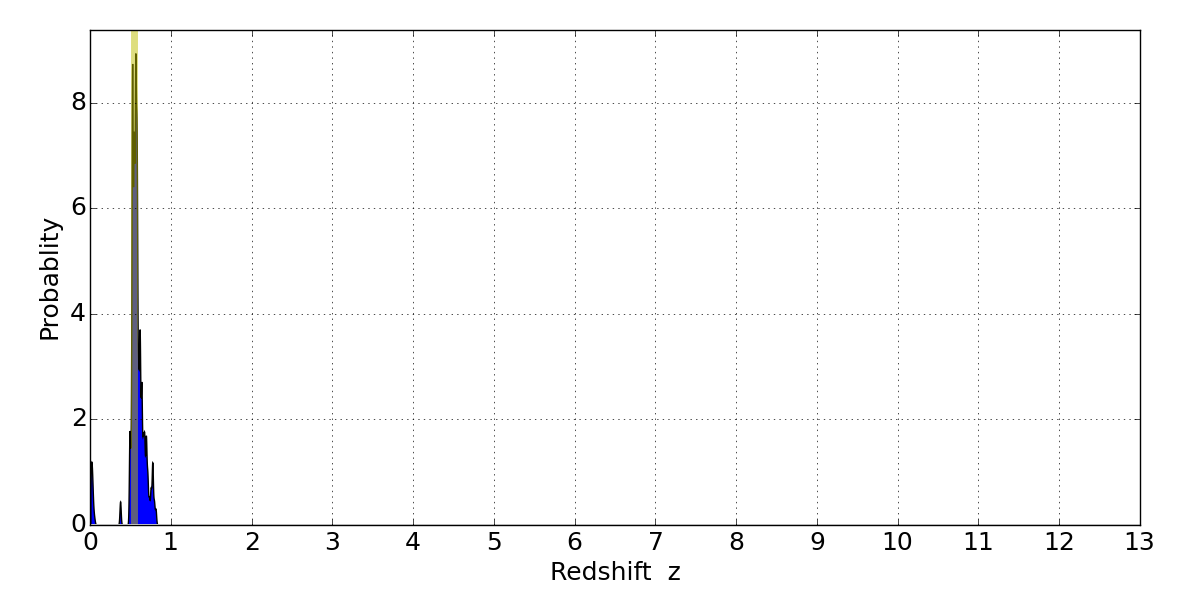 In P(z) plots: Yellow lines mark the cluster redshift z = 0.540,