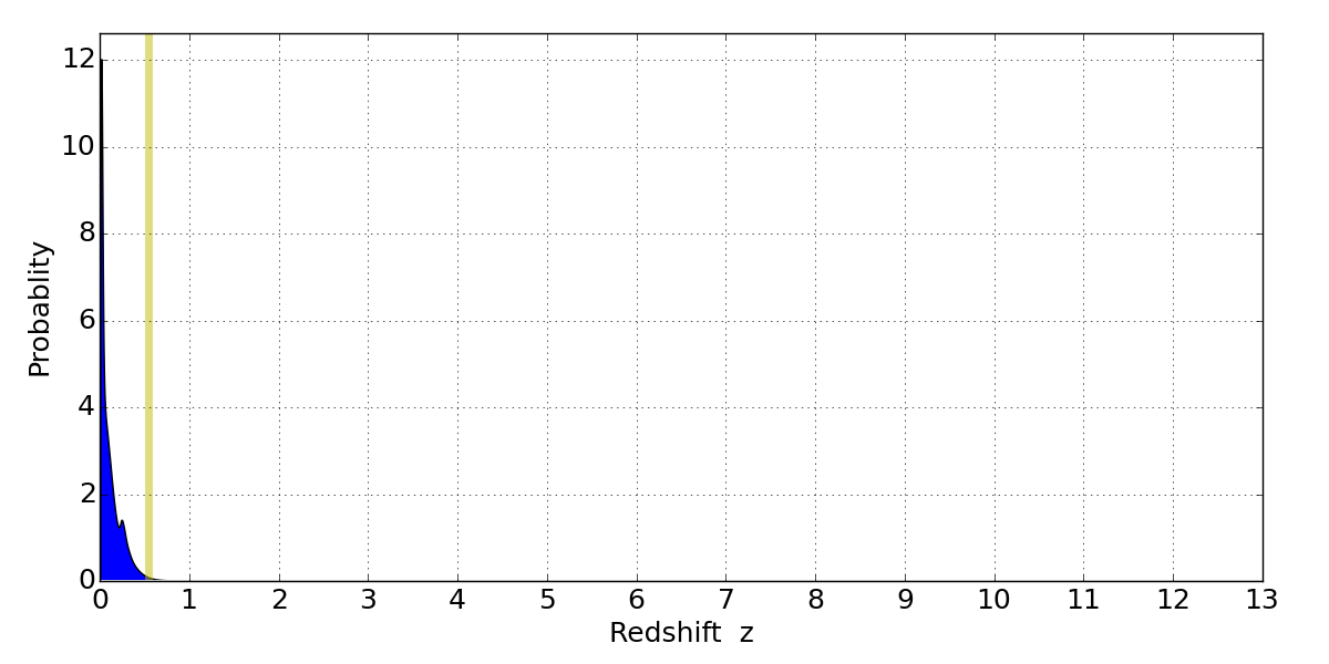 In P(z) plots: Yellow lines mark the cluster redshift z = 0.540,