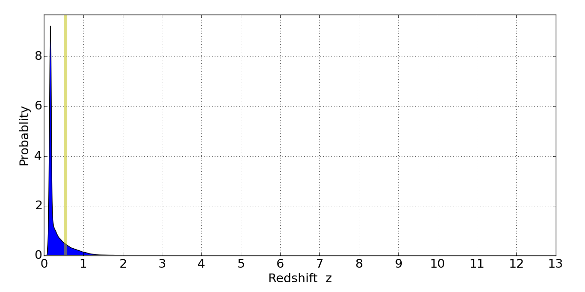 In P(z) plots: Yellow lines mark the cluster redshift z = 0.540,