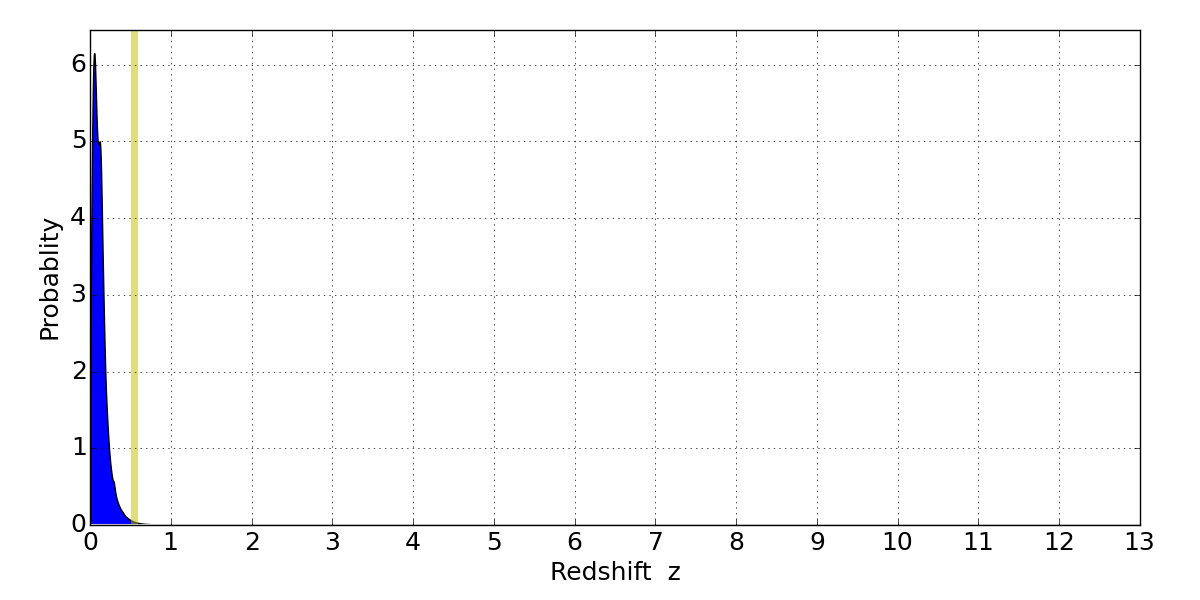 In P(z) plots: Yellow lines mark the cluster redshift z = 0.540,