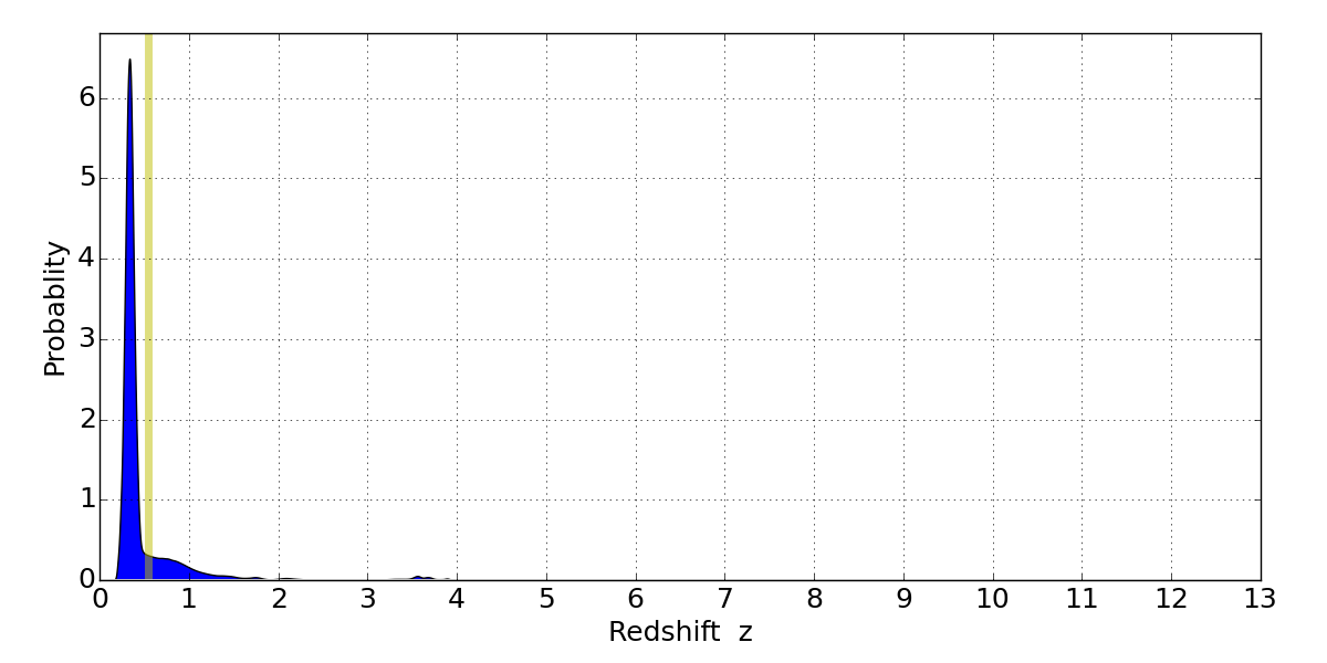 In P(z) plots: Yellow lines mark the cluster redshift z = 0.540,