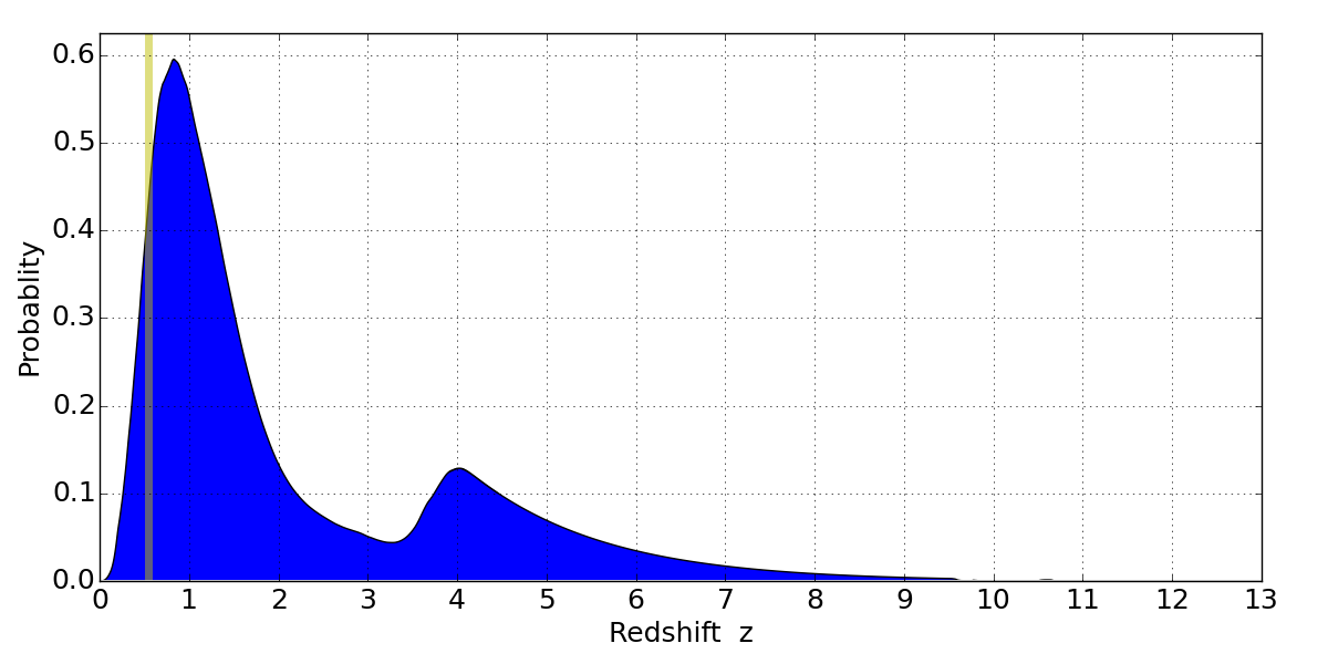 In P(z) plots: Yellow lines mark the cluster redshift z = 0.540,
