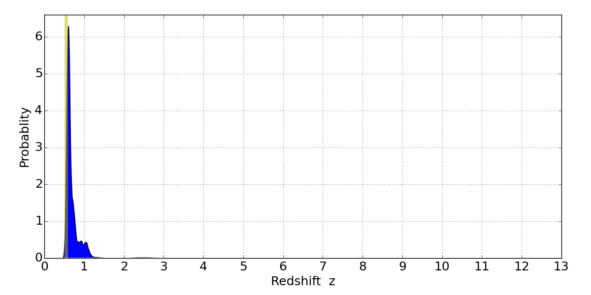 In P(z) plots: Yellow lines mark the cluster redshift z = 0.540,