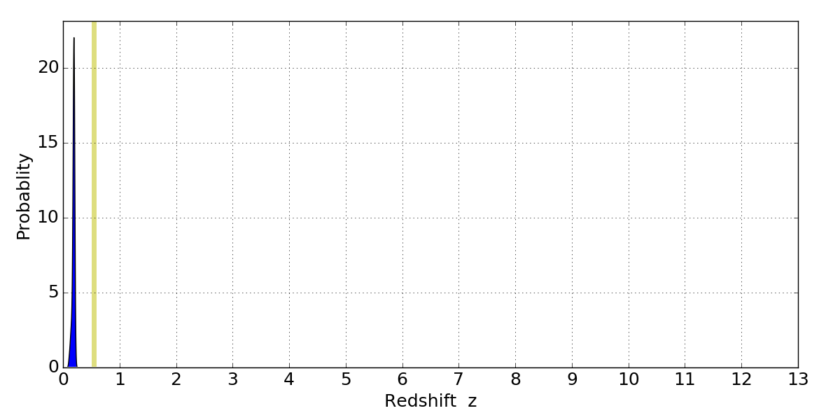 In P(z) plots: Yellow lines mark the cluster redshift z = 0.540,
