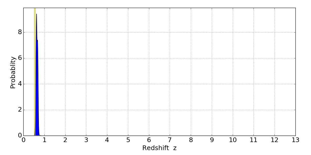 In P(z) plots: Yellow lines mark the cluster redshift z = 0.540,