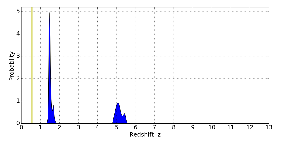 In P(z) plots: Yellow lines mark the cluster redshift z = 0.540,