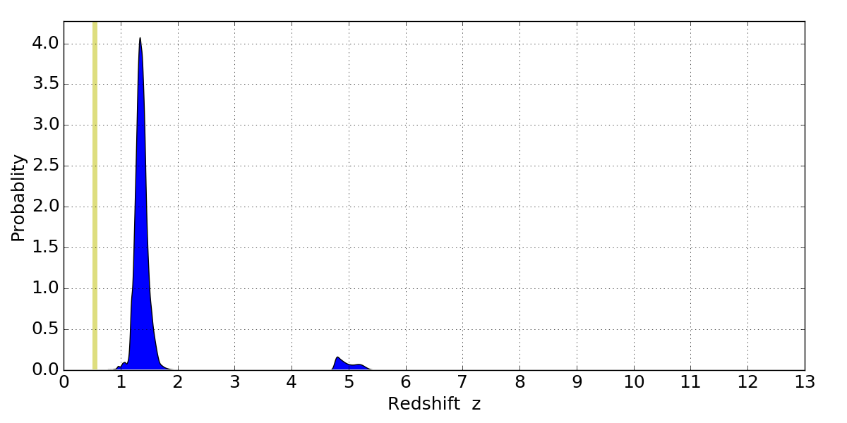 In P(z) plots: Yellow lines mark the cluster redshift z = 0.540,